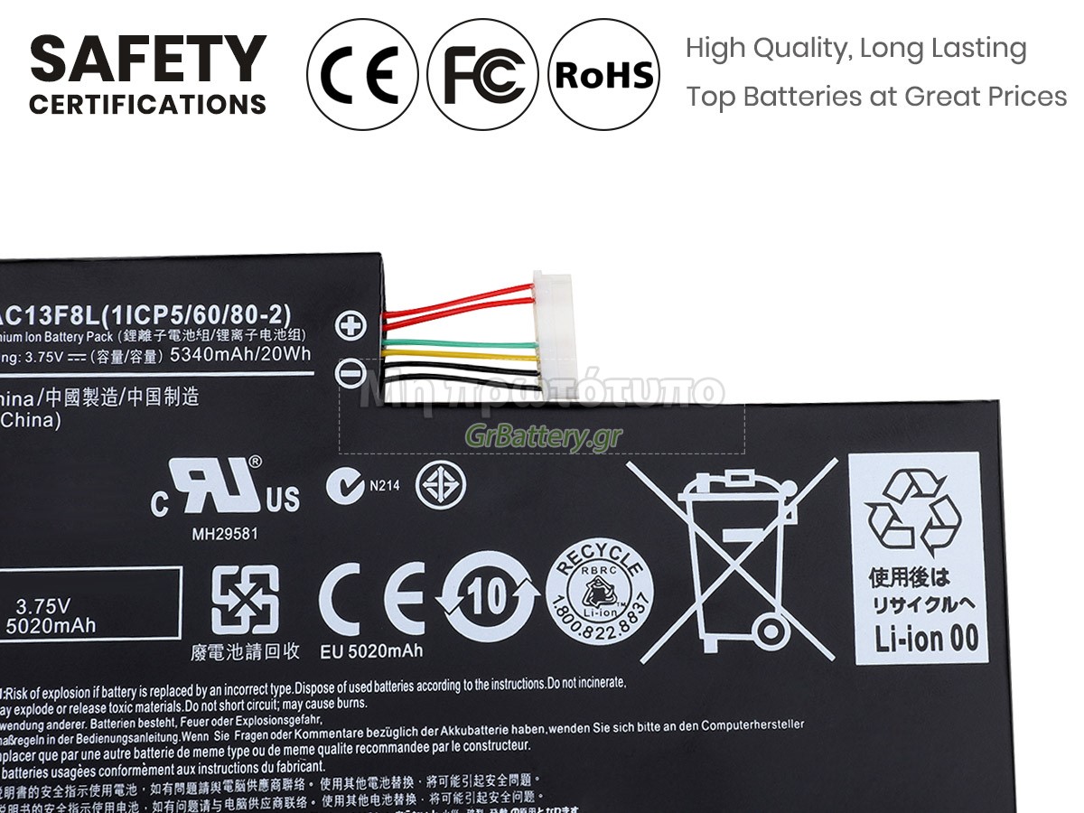 Η εντελώς νέα μας εφεδρική μπαταρία Acer AC13F8L αποτελείται από τα καλύτερα στοιχεία και εξαρτήματα. Οι μπαταρίες Acer AC13F8L που παρέχονται στο grbattery.gr έχουν περάσει δοκιμές UN38.3, RCM, CE, UL, ROHS, ISO9001/ISO9002 και άλλες διεθνείς πιστοποιήσεις. Προκειμένου να ελαχιστοποιηθούν οι κίνδυνοι ασφαλείας και να διασφαλιστεί η καλή εμπειρία του χρήστη, η μπαταρία φορητού υπολογιστή Acer AC13F8L χρησιμοποιεί μια ποικιλία μέτρων προστασίας. Για παράδειγμα, προστασία θερμοκρασίας, προστασία κυκλώματος, προστασία υπερφόρτισης, προστασία υλικού, όριο ρεύματος εξόδου και άλλα μέτρα προστασίας.