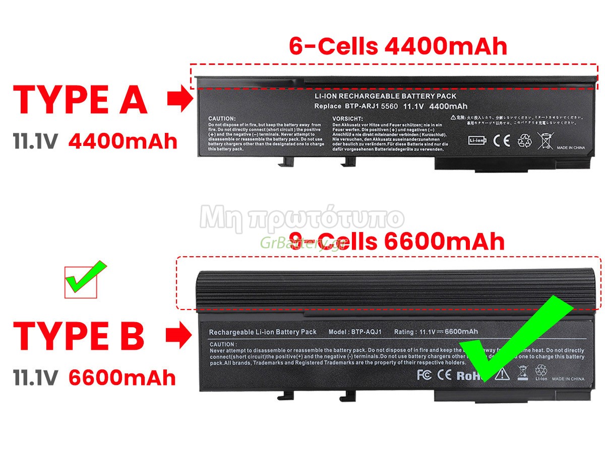 This is a high capacity battery, the back of this battery will extend out about 1 inch(bigger size). Η εντελώς νέα μας εφεδρική μπαταρία Acer BTP-AQJ1 αποτελείται από τα καλύτερα στοιχεία και εξαρτήματα. Οι μπαταρίες Acer BTP-AQJ1 που παρέχονται στο grbattery.gr έχουν περάσει δοκιμές UN38.3, RCM, CE, UL, ROHS, ISO9001/ISO9002 και άλλες διεθνείς πιστοποιήσεις. Προκειμένου να ελαχιστοποιηθούν οι κίνδυνοι ασφαλείας και να διασφαλιστεί η καλή εμπειρία του χρήστη, η μπαταρία φορητού υπολογιστή Acer BTP-AQJ1 χρησιμοποιεί μια ποικιλία μέτρων προστασίας. Για παράδειγμα, προστασία θερμοκρασίας, προστασία κυκλώματος, προστασία υπερφόρτισης, προστασία υλικού, όριο ρεύματος εξόδου και άλλα μέτρα προστασίας.