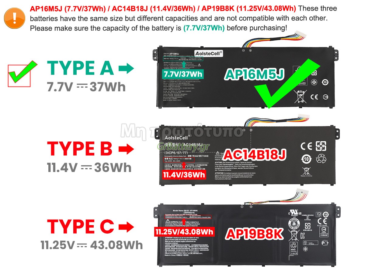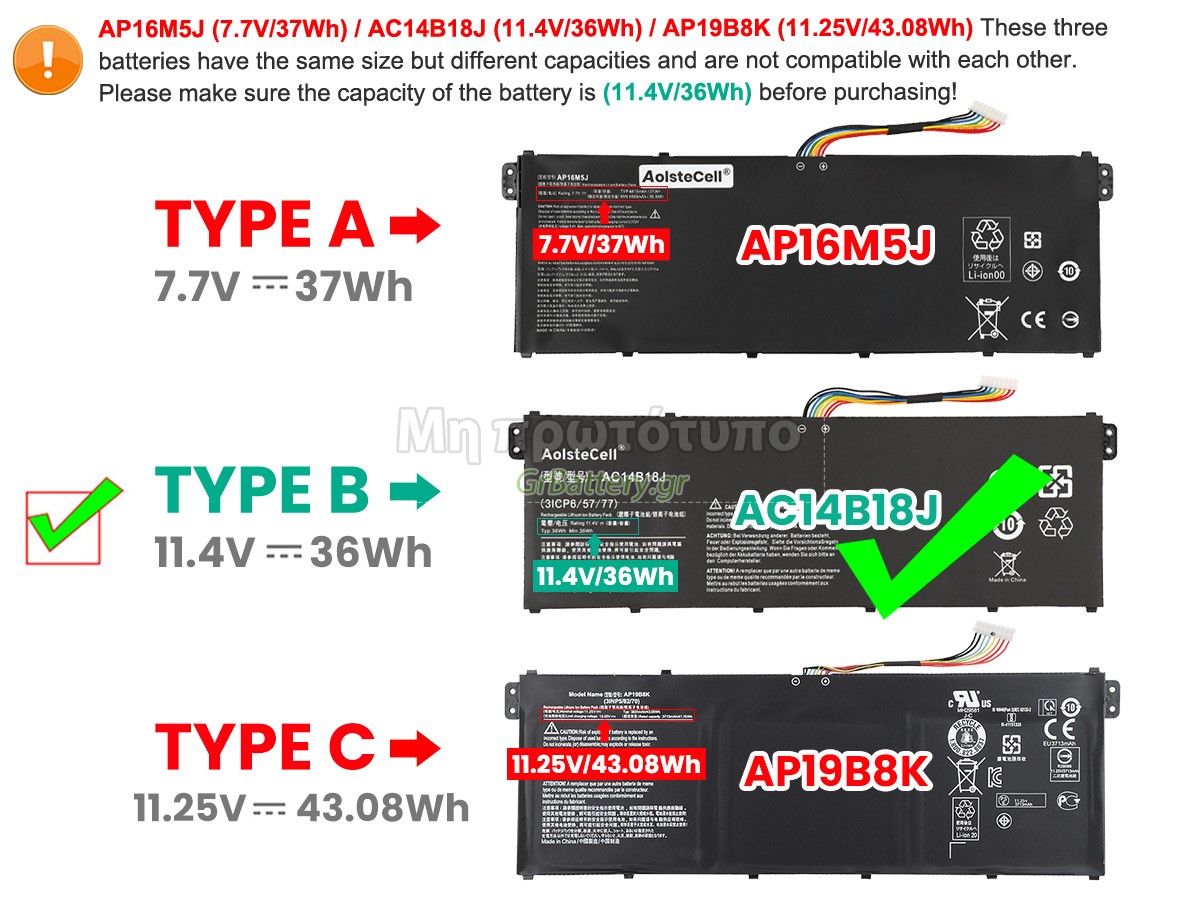 Please disassemble your computer before placing an order to confirm that your battery model is AP19B8K. Η εντελώς νέα μας εφεδρική μπαταρία Acer NX.GNVAA.024 αποτελείται από τα καλύτερα στοιχεία και εξαρτήματα. Οι μπαταρίες Acer NX.GNVAA.024 που παρέχονται στο grbattery.gr έχουν περάσει δοκιμές UN38.3, RCM, CE, UL, ROHS, ISO9001/ISO9002 και άλλες διεθνείς πιστοποιήσεις. Προκειμένου να ελαχιστοποιηθούν οι κίνδυνοι ασφαλείας και να διασφαλιστεί η καλή εμπειρία του χρήστη, η μπαταρία φορητού υπολογιστή Acer NX.GNVAA.024 χρησιμοποιεί μια ποικιλία μέτρων προστασίας. Για παράδειγμα, προστασία θερμοκρασίας, προστασία κυκλώματος, προστασία υπερφόρτισης, προστασία υλικού, όριο ρεύματος εξόδου και άλλα μέτρα προστασίας.