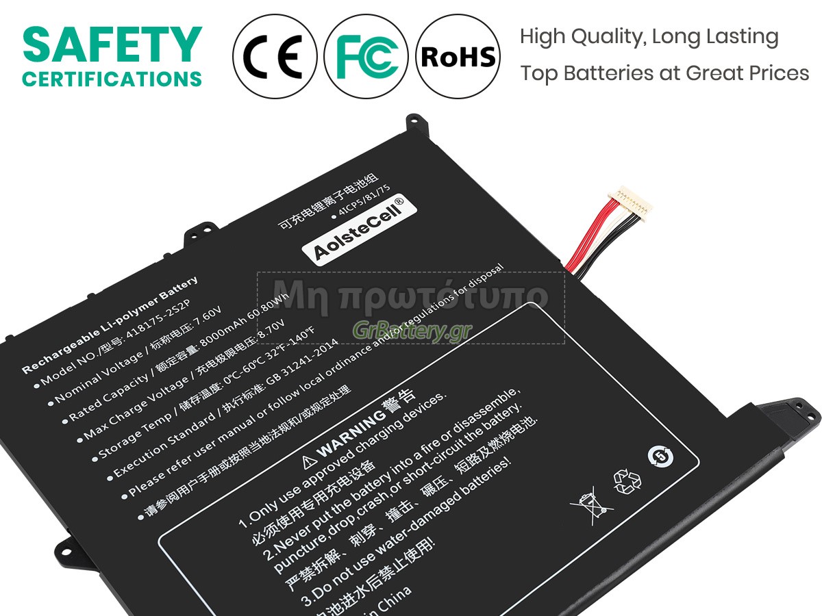 Παρέχουμε εγγύηση ενός έτους για όλες τις μπαταρίες φορητών υπολογιστών. Η εγγύηση ισχύει αν ο αγοραστής έχει εγκαταστήσει και χρησιμοποιήσει σωστά την μπαταρία στη συσκευή.
