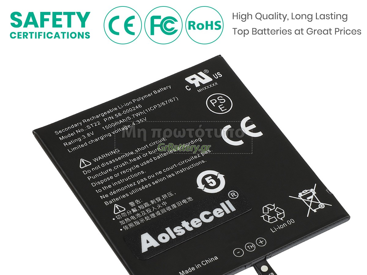 Η εντελώς νέα μας εφεδρική μπαταρία Amazon ST22 αποτελείται από τα καλύτερα στοιχεία και εξαρτήματα. Οι μπαταρίες Amazon ST22 που παρέχονται στο grbattery.gr έχουν περάσει δοκιμές UN38.3, RCM, CE, UL, ROHS, ISO9001/ISO9002 και άλλες διεθνείς πιστοποιήσεις. Προκειμένου να ελαχιστοποιηθούν οι κίνδυνοι ασφαλείας και να διασφαλιστεί η καλή εμπειρία του χρήστη, η μπαταρία φορητού υπολογιστή Amazon ST22 χρησιμοποιεί μια ποικιλία μέτρων προστασίας. Για παράδειγμα, προστασία θερμοκρασίας, προστασία κυκλώματος, προστασία υπερφόρτισης, προστασία υλικού, όριο ρεύματος εξόδου και άλλα μέτρα προστασίας.