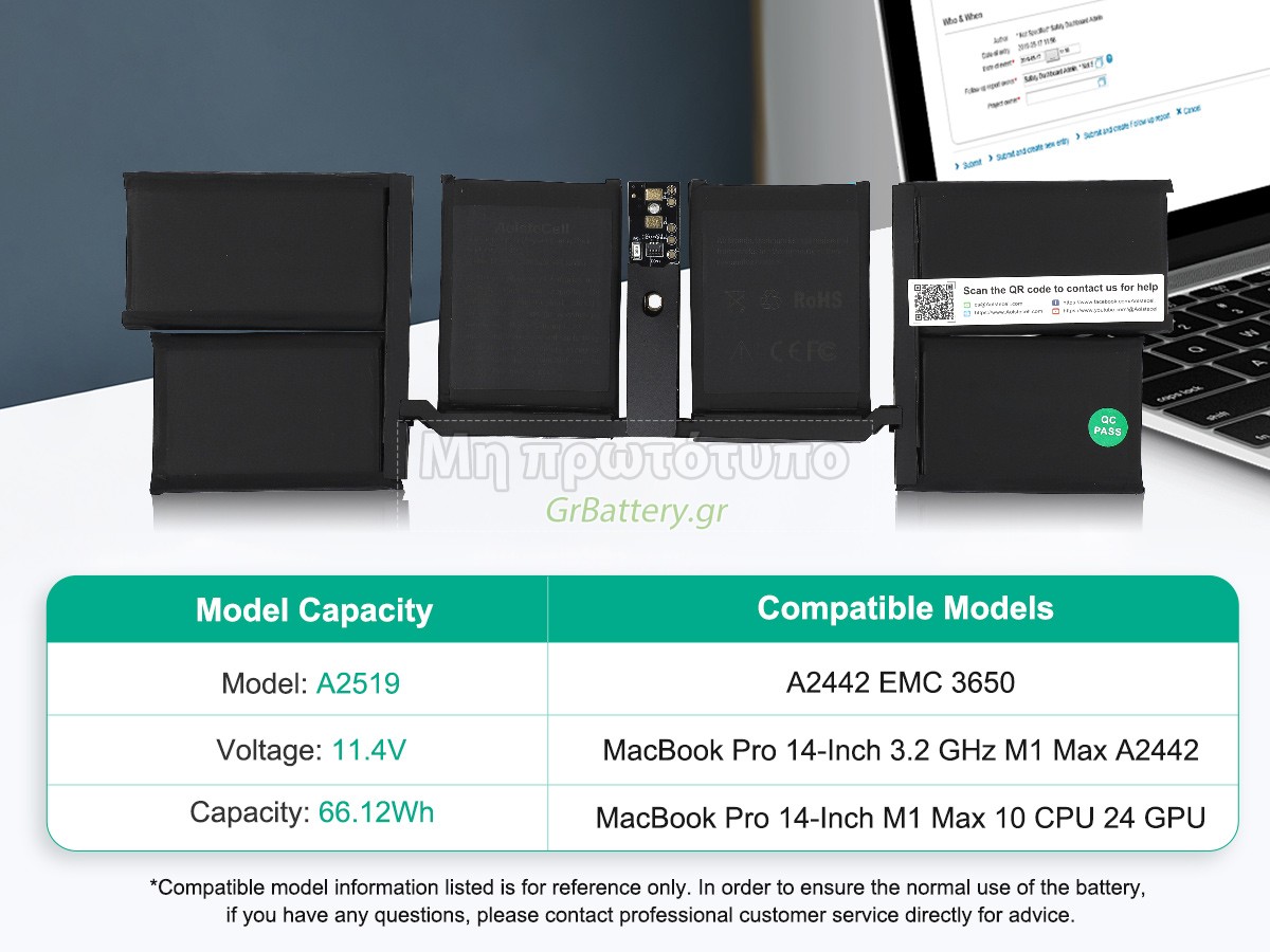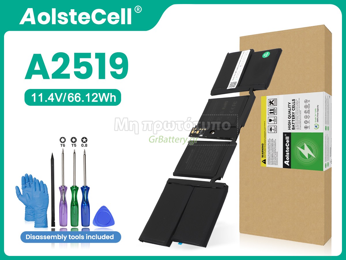Δεν συνιστάται η αφαίρεση της μπαταρίας, έτσι ώστε να αποφευχθεί η συνέχιση της λειτουργίας της τροφοδοσίας εναλλασσόμενου ρεύματος σε περίπτωση ξαφνικής διακοπής, χωρίς απώλεια δεδομένων. Αν αφαιρεθεί, συνιστάται η περιτύλιξη της μπαταρίας Apple A2519 στην πλαστική μεμβράνη και η τοποθέτηση σε στεγνό και δροσερό μέρος, και να θυμάστε να χρησιμοποιείτε την μπαταρία τουλάχιστον μια φορά το μήνα και να την φορτίζετε για να αποφύγετε την απώλεια δράσης της μπαταρίας.