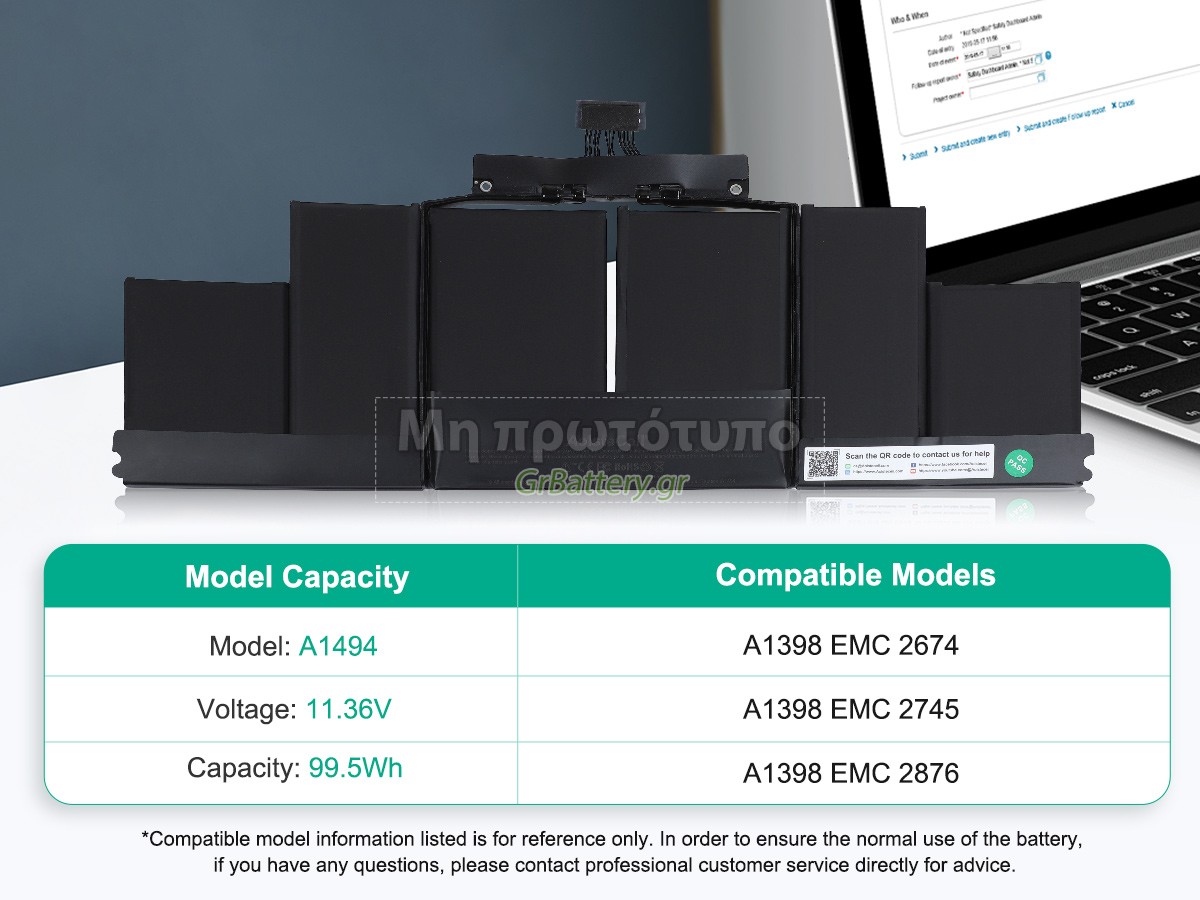 Δεν συνιστάται η αφαίρεση της μπαταρίας, έτσι ώστε να αποφευχθεί η συνέχιση της λειτουργίας της τροφοδοσίας εναλλασσόμενου ρεύματος σε περίπτωση ξαφνικής διακοπής, χωρίς απώλεια δεδομένων. Αν αφαιρεθεί, συνιστάται η περιτύλιξη της μπαταρίας Apple ME294LL/A στην πλαστική μεμβράνη και η τοποθέτηση σε στεγνό και δροσερό μέρος, και να θυμάστε να χρησιμοποιείτε την μπαταρία τουλάχιστον μια φορά το μήνα και να την φορτίζετε για να αποφύγετε την απώλεια δράσης της μπαταρίας.