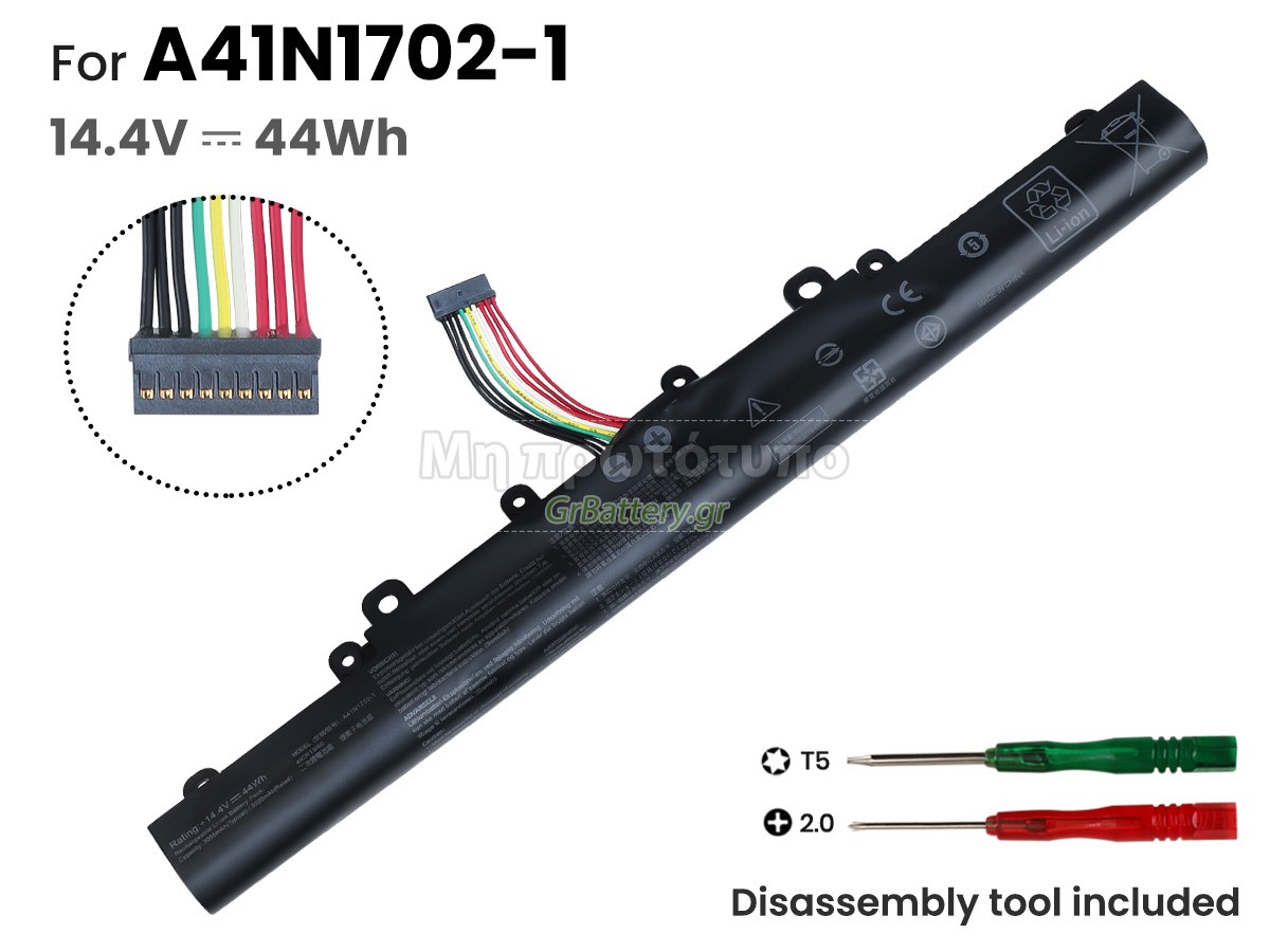 Δεν συνιστάται η αφαίρεση της μπαταρίας, έτσι ώστε να αποφευχθεί η συνέχιση της λειτουργίας της τροφοδοσίας εναλλασσόμενου ρεύματος σε περίπτωση ξαφνικής διακοπής, χωρίς απώλεια δεδομένων. Αν αφαιρεθεί, συνιστάται η περιτύλιξη της μπαταρίας Asus A41N1702 στην πλαστική μεμβράνη και η τοποθέτηση σε στεγνό και δροσερό μέρος, και να θυμάστε να χρησιμοποιείτε την μπαταρία τουλάχιστον μια φορά το μήνα και να την φορτίζετε για να αποφύγετε την απώλεια δράσης της μπαταρίας.