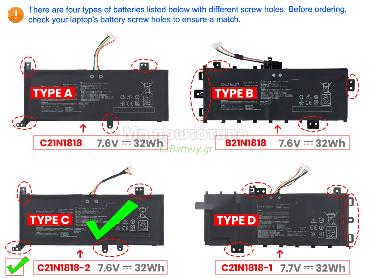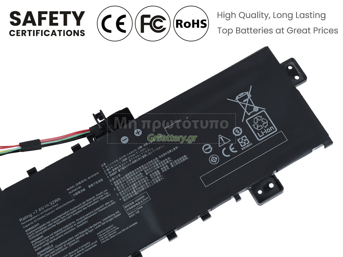 There are 2 types battery, before placing an order please ensure your old battery model name is [C21N1818], not [C21N1818-1] or [C21N1818-2]. Η εντελώς νέα μας εφεδρική μπαταρία Asus C21N1818 αποτελείται από τα καλύτερα στοιχεία και εξαρτήματα. Οι μπαταρίες Asus C21N1818 που παρέχονται στο grbattery.gr έχουν περάσει δοκιμές UN38.3, RCM, CE, UL, ROHS, ISO9001/ISO9002 και άλλες διεθνείς πιστοποιήσεις. Προκειμένου να ελαχιστοποιηθούν οι κίνδυνοι ασφαλείας και να διασφαλιστεί η καλή εμπειρία του χρήστη, η μπαταρία φορητού υπολογιστή Asus C21N1818 χρησιμοποιεί μια ποικιλία μέτρων προστασίας. Για παράδειγμα, προστασία θερμοκρασίας, προστασία κυκλώματος, προστασία υπερφόρτισης, προστασία υλικού, όριο ρεύματος εξόδου και άλλα μέτρα προστασίας.