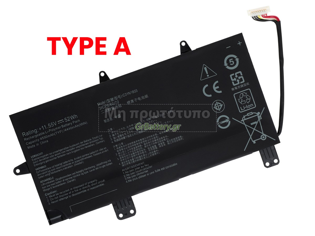 Before placing an order please ensure your old battery is 15.4V, 70Wh 4 Cell, not is 11.55V, 52Wh 3 Cell. This battery is not compatible with 11.55V. Η εντελώς νέα μας εφεδρική μπαταρία Asus C31N1803 αποτελείται από τα καλύτερα στοιχεία και εξαρτήματα. Οι μπαταρίες Asus C31N1803 που παρέχονται στο grbattery.gr έχουν περάσει δοκιμές UN38.3, RCM, CE, UL, ROHS, ISO9001/ISO9002 και άλλες διεθνείς πιστοποιήσεις. Προκειμένου να ελαχιστοποιηθούν οι κίνδυνοι ασφαλείας και να διασφαλιστεί η καλή εμπειρία του χρήστη, η μπαταρία φορητού υπολογιστή Asus C31N1803 χρησιμοποιεί μια ποικιλία μέτρων προστασίας. Για παράδειγμα, προστασία θερμοκρασίας, προστασία κυκλώματος, προστασία υπερφόρτισης, προστασία υλικού, όριο ρεύματος εξόδου και άλλα μέτρα προστασίας.