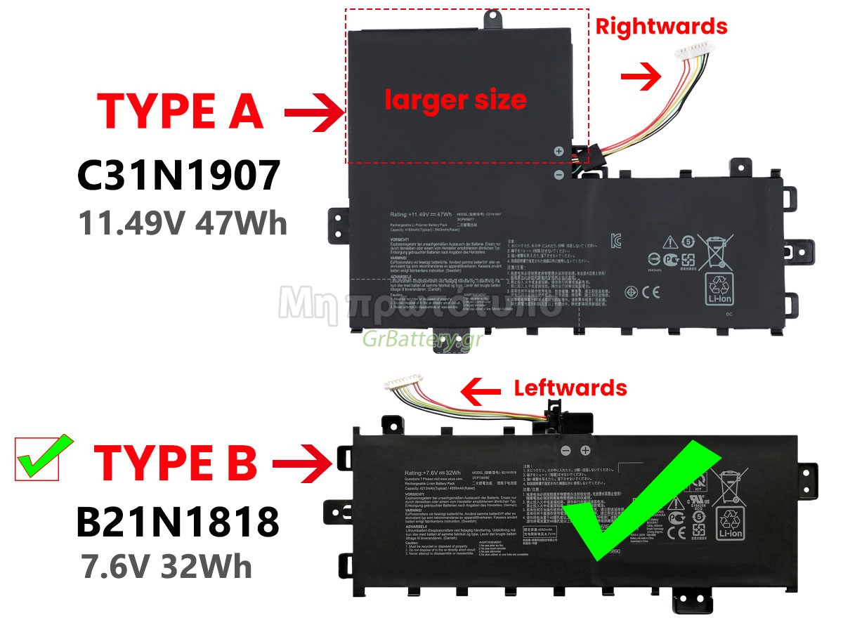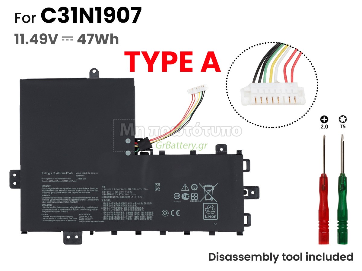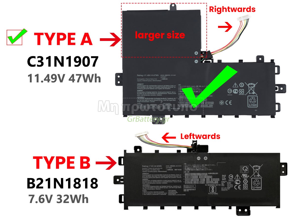 There are 2 types battery, before placing an order please open your laptop to check your old battery first, ensure it's the same as ours. Η εντελώς νέα μας εφεδρική μπαταρία Asus C31N1907 αποτελείται από τα καλύτερα στοιχεία και εξαρτήματα. Οι μπαταρίες Asus C31N1907 που παρέχονται στο grbattery.gr έχουν περάσει δοκιμές UN38.3, RCM, CE, UL, ROHS, ISO9001/ISO9002 και άλλες διεθνείς πιστοποιήσεις. Προκειμένου να ελαχιστοποιηθούν οι κίνδυνοι ασφαλείας και να διασφαλιστεί η καλή εμπειρία του χρήστη, η μπαταρία φορητού υπολογιστή Asus C31N1907 χρησιμοποιεί μια ποικιλία μέτρων προστασίας. Για παράδειγμα, προστασία θερμοκρασίας, προστασία κυκλώματος, προστασία υπερφόρτισης, προστασία υλικού, όριο ρεύματος εξόδου και άλλα μέτρα προστασίας.