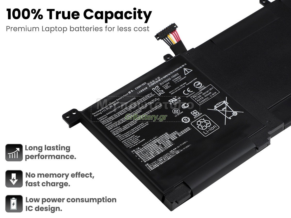 Δεν συνιστάται η αφαίρεση της μπαταρίας, έτσι ώστε να αποφευχθεί η συνέχιση της λειτουργίας της τροφοδοσίας εναλλασσόμενου ρεύματος σε περίπτωση ξαφνικής διακοπής, χωρίς απώλεια δεδομένων. Αν αφαιρεθεί, συνιστάται η περιτύλιξη της μπαταρίας Asus C32N1523 στην πλαστική μεμβράνη και η τοποθέτηση σε στεγνό και δροσερό μέρος, και να θυμάστε να χρησιμοποιείτε την μπαταρία τουλάχιστον μια φορά το μήνα και να την φορτίζετε για να αποφύγετε την απώλεια δράσης της μπαταρίας.