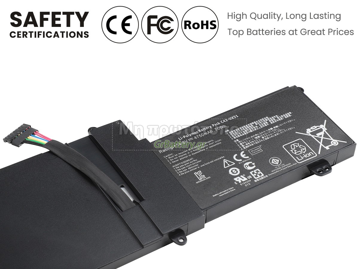 Δεν συνιστάται η αφαίρεση της μπαταρίας, έτσι ώστε να αποφευχθεί η συνέχιση της λειτουργίας της τροφοδοσίας εναλλασσόμενου ρεύματος σε περίπτωση ξαφνικής διακοπής, χωρίς απώλεια δεδομένων. Αν αφαιρεθεί, συνιστάται η περιτύλιξη της μπαταρίας Asus C42-UX51 στην πλαστική μεμβράνη και η τοποθέτηση σε στεγνό και δροσερό μέρος, και να θυμάστε να χρησιμοποιείτε την μπαταρία τουλάχιστον μια φορά το μήνα και να την φορτίζετε για να αποφύγετε την απώλεια δράσης της μπαταρίας.