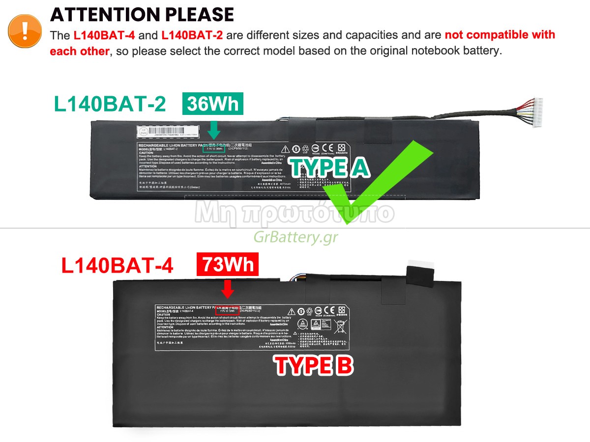 Δεν συνιστάται η αφαίρεση της μπαταρίας, έτσι ώστε να αποφευχθεί η συνέχιση της λειτουργίας της τροφοδοσίας εναλλασσόμενου ρεύματος σε περίπτωση ξαφνικής διακοπής, χωρίς απώλεια δεδομένων. Αν αφαιρεθεί, συνιστάται η περιτύλιξη της μπαταρίας Clevo L140MU στην πλαστική μεμβράνη και η τοποθέτηση σε στεγνό και δροσερό μέρος, και να θυμάστε να χρησιμοποιείτε την μπαταρία τουλάχιστον μια φορά το μήνα και να την φορτίζετε για να αποφύγετε την απώλεια δράσης της μπαταρίας.