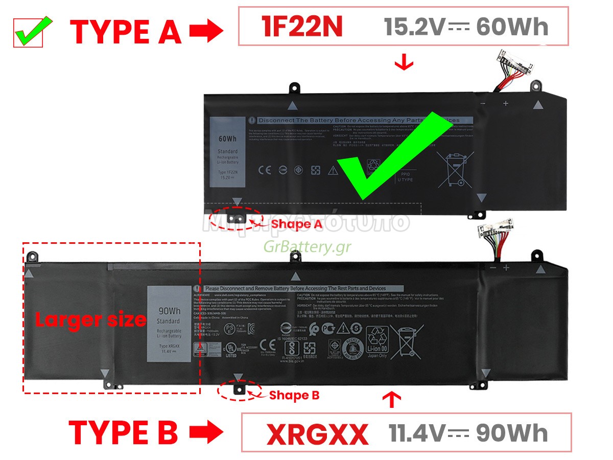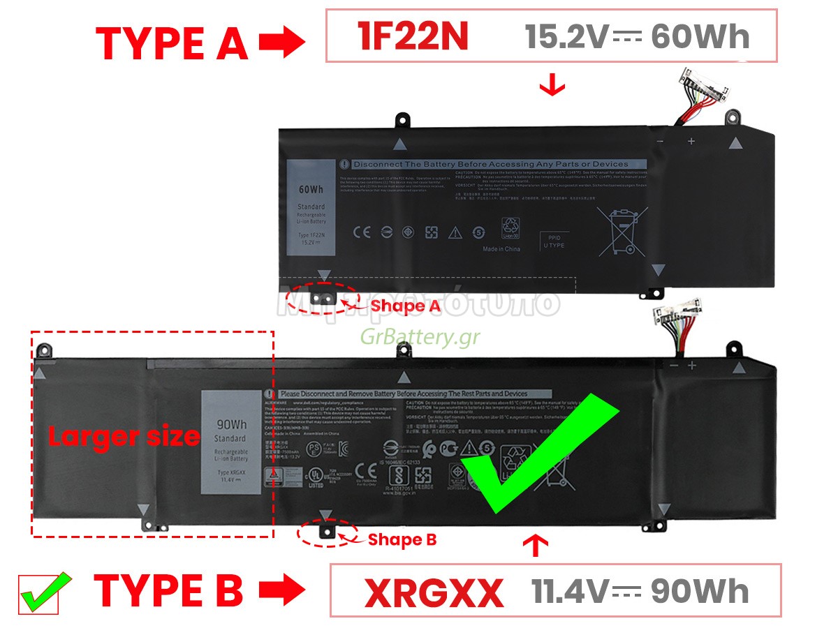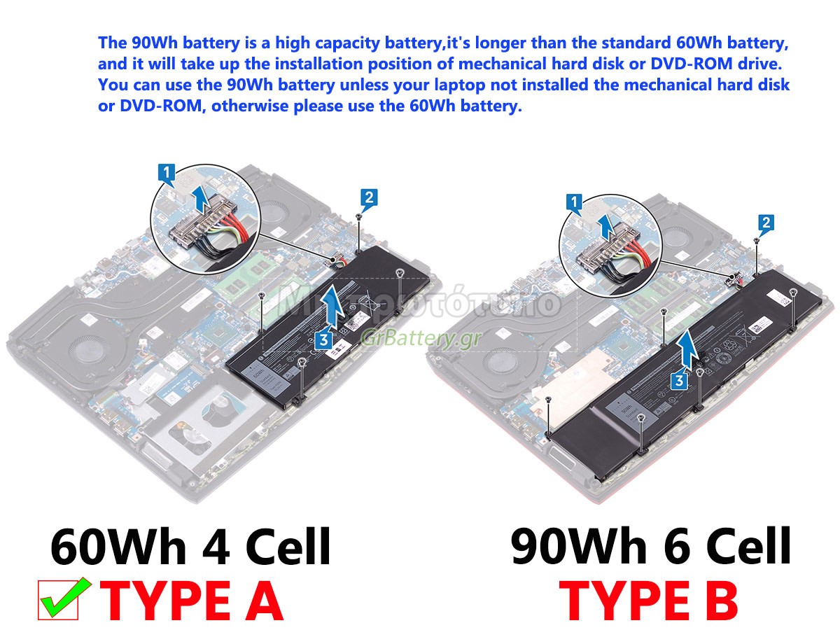 This is a high capacity(90Wh) battery,it's longer than the standard 60Wh battery, and it will take up the installation position of mechanical hard disk or DVD-ROM drive. You can use the 90Wh battery unless your laptop not installed the mechanical hard disk or DVD-ROM, otherwise please use the 60Wh battery. Η εντελώς νέα μας εφεδρική μπαταρία Dell G7 17 7790 αποτελείται από τα καλύτερα στοιχεία και εξαρτήματα. Οι μπαταρίες Dell G7 17 7790 που παρέχονται στο grbattery.gr έχουν περάσει δοκιμές UN38.3, RCM, CE, UL, ROHS, ISO9001/ISO9002 και άλλες διεθνείς πιστοποιήσεις. Προκειμένου να ελαχιστοποιηθούν οι κίνδυνοι ασφαλείας και να διασφαλιστεί η καλή εμπειρία του χρήστη, η μπαταρία φορητού υπολογιστή Dell G7 17 7790 χρησιμοποιεί μια ποικιλία μέτρων προστασίας. Για παράδειγμα, προστασία θερμοκρασίας, προστασία κυκλώματος, προστασία υπερφόρτισης, προστασία υλικού, όριο ρεύματος εξόδου και άλλα μέτρα προστασίας.