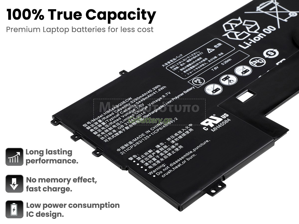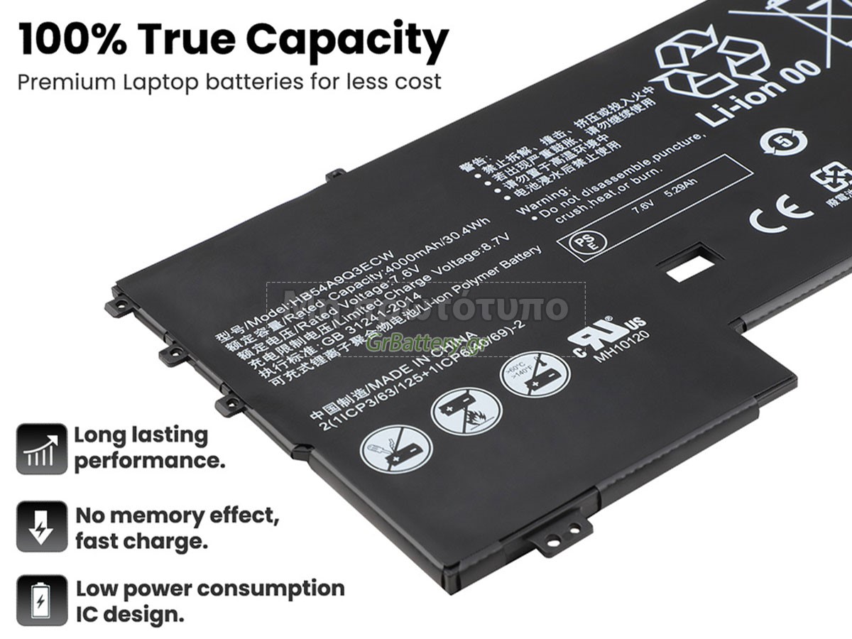 There are 3 types battery named "HB54A9Q3ECW", before placing an order please check your old battery first, ensure the connector is same to our battery Type C. Η εντελώς νέα μας εφεδρική μπαταρία Huawei WT-W19 αποτελείται από τα καλύτερα στοιχεία και εξαρτήματα. Οι μπαταρίες Huawei WT-W19 που παρέχονται στο grbattery.gr έχουν περάσει δοκιμές UN38.3, RCM, CE, UL, ROHS, ISO9001/ISO9002 και άλλες διεθνείς πιστοποιήσεις. Προκειμένου να ελαχιστοποιηθούν οι κίνδυνοι ασφαλείας και να διασφαλιστεί η καλή εμπειρία του χρήστη, η μπαταρία φορητού υπολογιστή Huawei WT-W19 χρησιμοποιεί μια ποικιλία μέτρων προστασίας. Για παράδειγμα, προστασία θερμοκρασίας, προστασία κυκλώματος, προστασία υπερφόρτισης, προστασία υλικού, όριο ρεύματος εξόδου και άλλα μέτρα προστασίας.