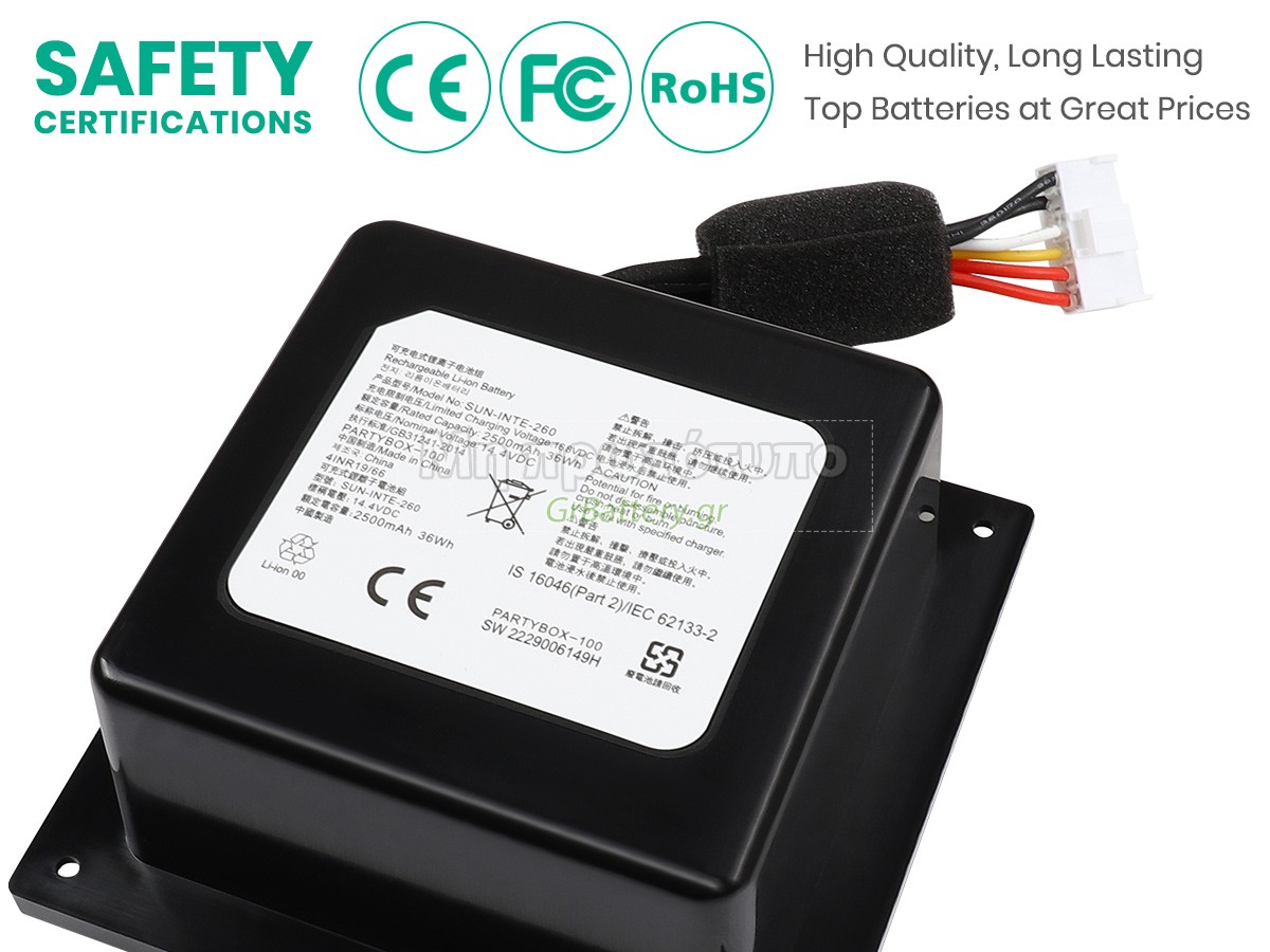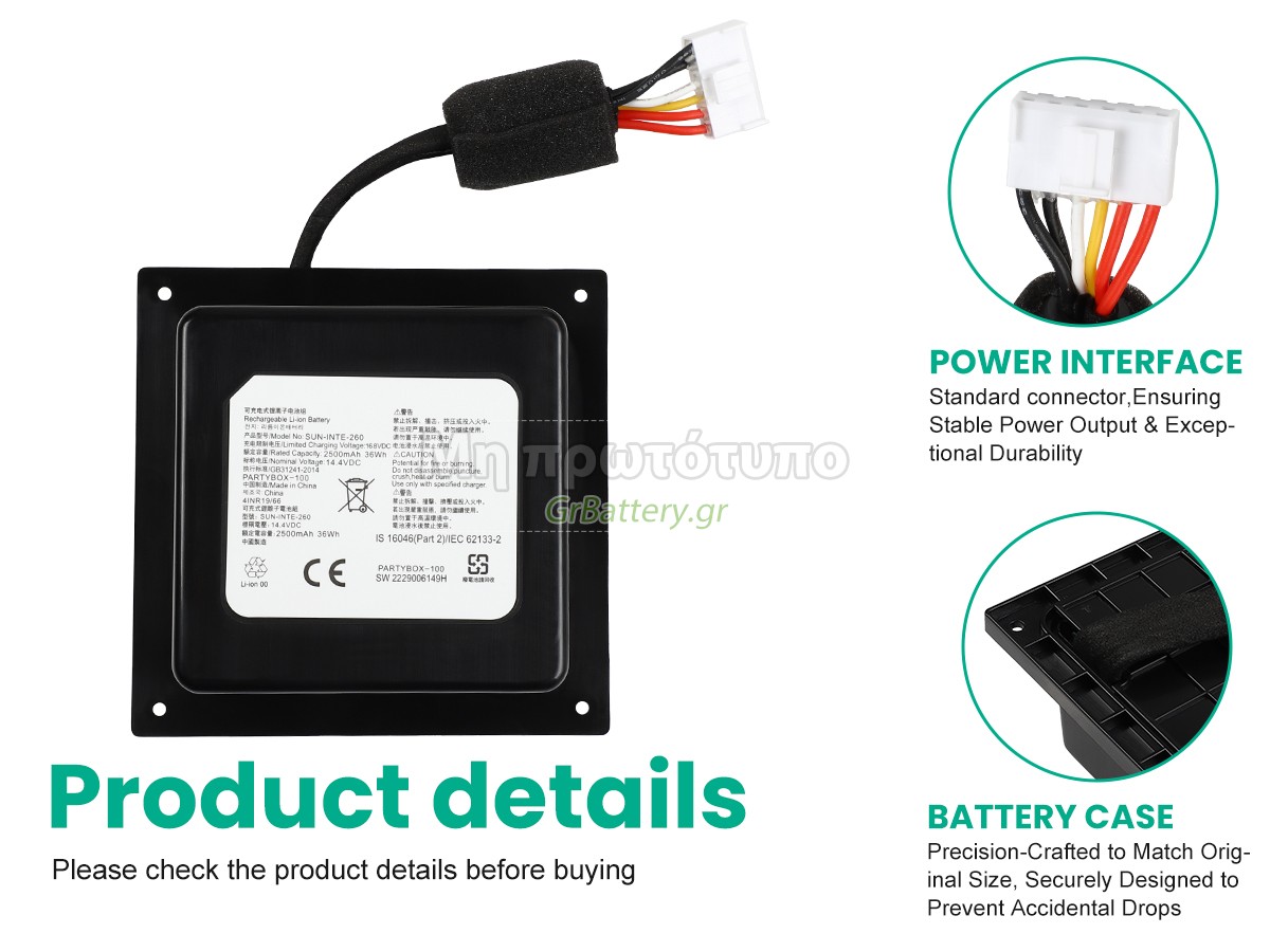 Η εντελώς νέα μας εφεδρική μπαταρία JBL PARTYBOX 100 αποτελείται από τα καλύτερα στοιχεία και εξαρτήματα. Οι μπαταρίες JBL PARTYBOX 100 που παρέχονται στο grbattery.gr έχουν περάσει δοκιμές UN38.3, RCM, CE, UL, ROHS, ISO9001/ISO9002 και άλλες διεθνείς πιστοποιήσεις. Προκειμένου να ελαχιστοποιηθούν οι κίνδυνοι ασφαλείας και να διασφαλιστεί η καλή εμπειρία του χρήστη, η μπαταρία ήχος JBL PARTYBOX 100 χρησιμοποιεί μια ποικιλία μέτρων προστασίας. Για παράδειγμα, προστασία θερμοκρασίας, προστασία κυκλώματος, προστασία υπερφόρτισης, προστασία υλικού, όριο ρεύματος εξόδου και άλλα μέτρα προστασίας.
