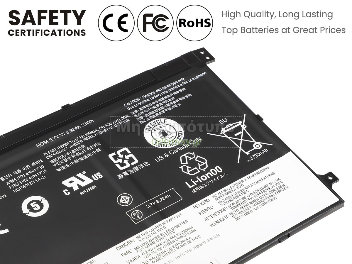 Η εντελώς νέα μας εφεδρική μπαταρία Lenovo 45N1731 αποτελείται από τα καλύτερα στοιχεία και εξαρτήματα. Οι μπαταρίες Lenovo 45N1731 που παρέχονται στο grbattery.gr έχουν περάσει δοκιμές UN38.3, RCM, CE, UL, ROHS, ISO9001/ISO9002 και άλλες διεθνείς πιστοποιήσεις. Προκειμένου να ελαχιστοποιηθούν οι κίνδυνοι ασφαλείας και να διασφαλιστεί η καλή εμπειρία του χρήστη, η μπαταρία φορητού υπολογιστή Lenovo 45N1731 χρησιμοποιεί μια ποικιλία μέτρων προστασίας. Για παράδειγμα, προστασία θερμοκρασίας, προστασία κυκλώματος, προστασία υπερφόρτισης, προστασία υλικού, όριο ρεύματος εξόδου και άλλα μέτρα προστασίας.