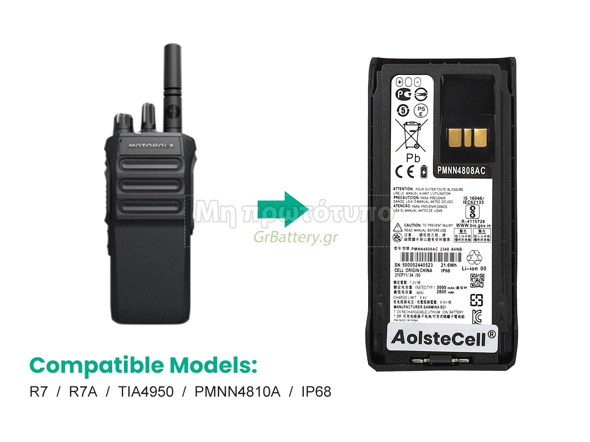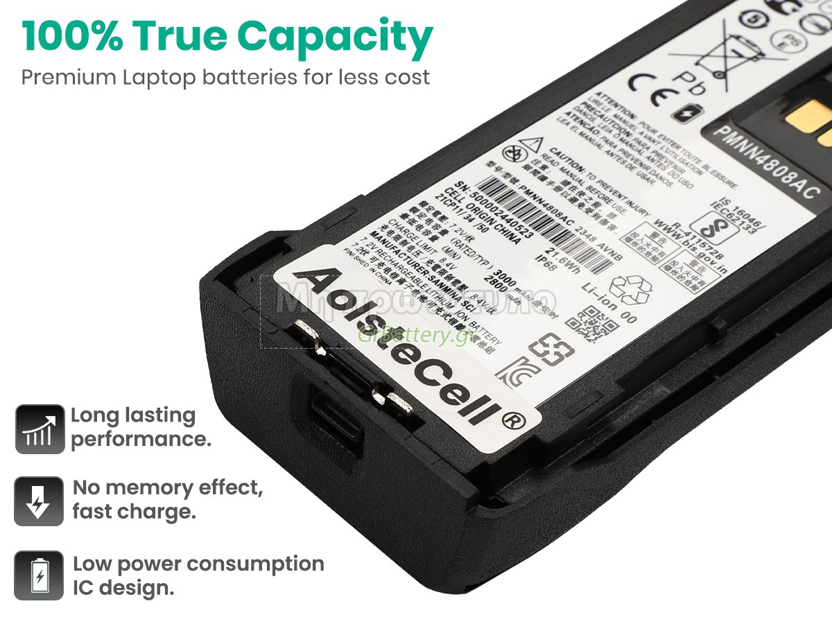 Η αντικατεστημένη μπαταρία του Motorola PMNN4809A είναι εντελώς νέα. Ποτέ δεν θα πουλήσουμε χρησιμοποιημένες μπαταρίες ή ανακαινισμένες μπαταρίες. Οι μπαταρίες μας είναι κατασκευασμένες από τα καλύτερα στοιχεία και εξαρτήματα