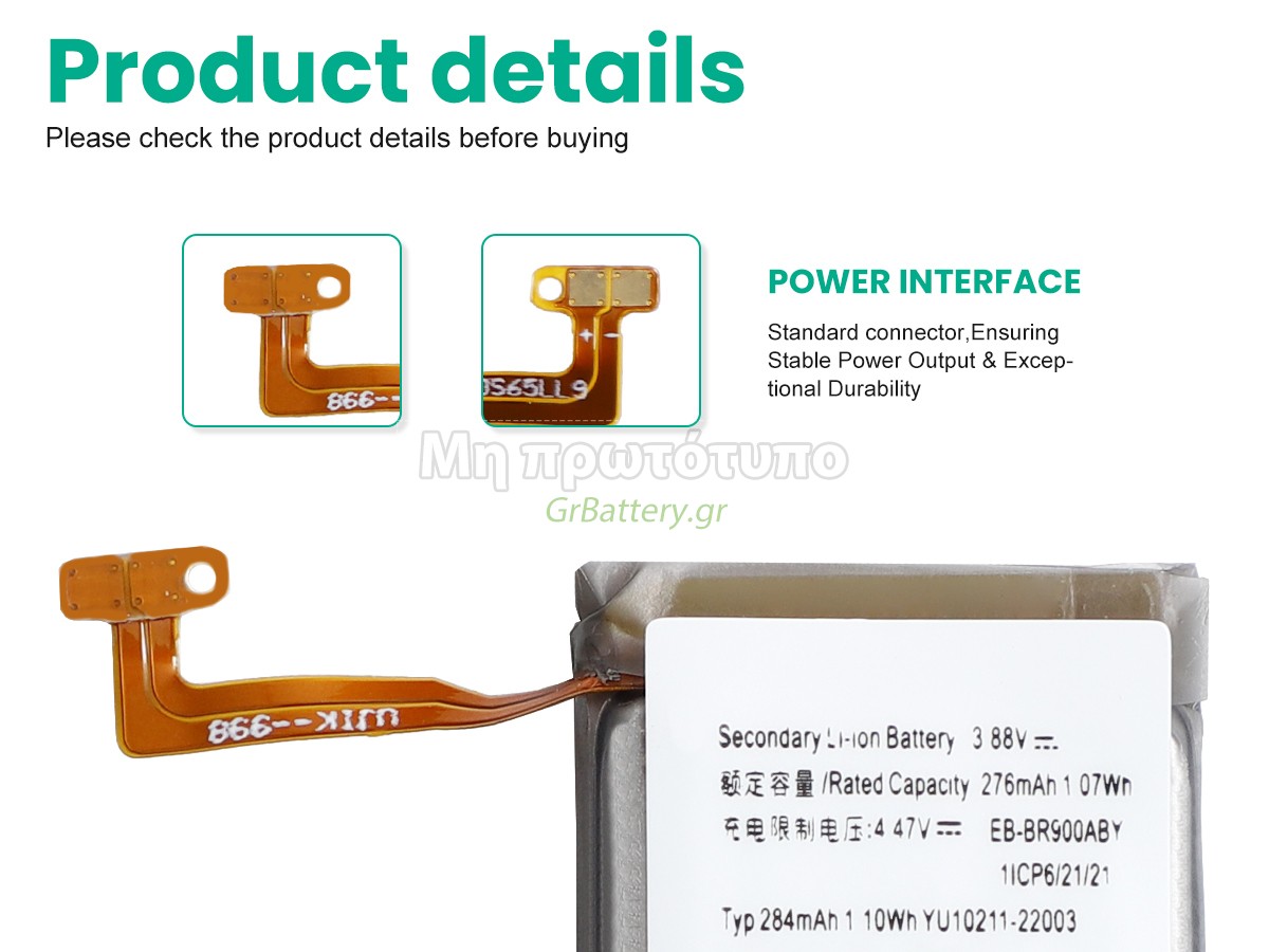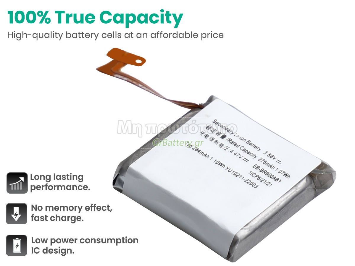 Η εντελώς νέα μας εφεδρική μπαταρία Samsung EB-BR900ABY αποτελείται από τα καλύτερα στοιχεία και εξαρτήματα. Οι μπαταρίες Samsung EB-BR900ABY που παρέχονται στο grbattery.gr έχουν περάσει δοκιμές UN38.3, RCM, CE, UL, ROHS, ISO9001/ISO9002 και άλλες διεθνείς πιστοποιήσεις. Προκειμένου να ελαχιστοποιηθούν οι κίνδυνοι ασφαλείας και να διασφαλιστεί η καλή εμπειρία του χρήστη, η μπαταρία ρολόι Samsung EB-BR900ABY χρησιμοποιεί μια ποικιλία μέτρων προστασίας. Για παράδειγμα, προστασία θερμοκρασίας, προστασία κυκλώματος, προστασία υπερφόρτισης, προστασία υλικού, όριο ρεύματος εξόδου και άλλα μέτρα προστασίας.
