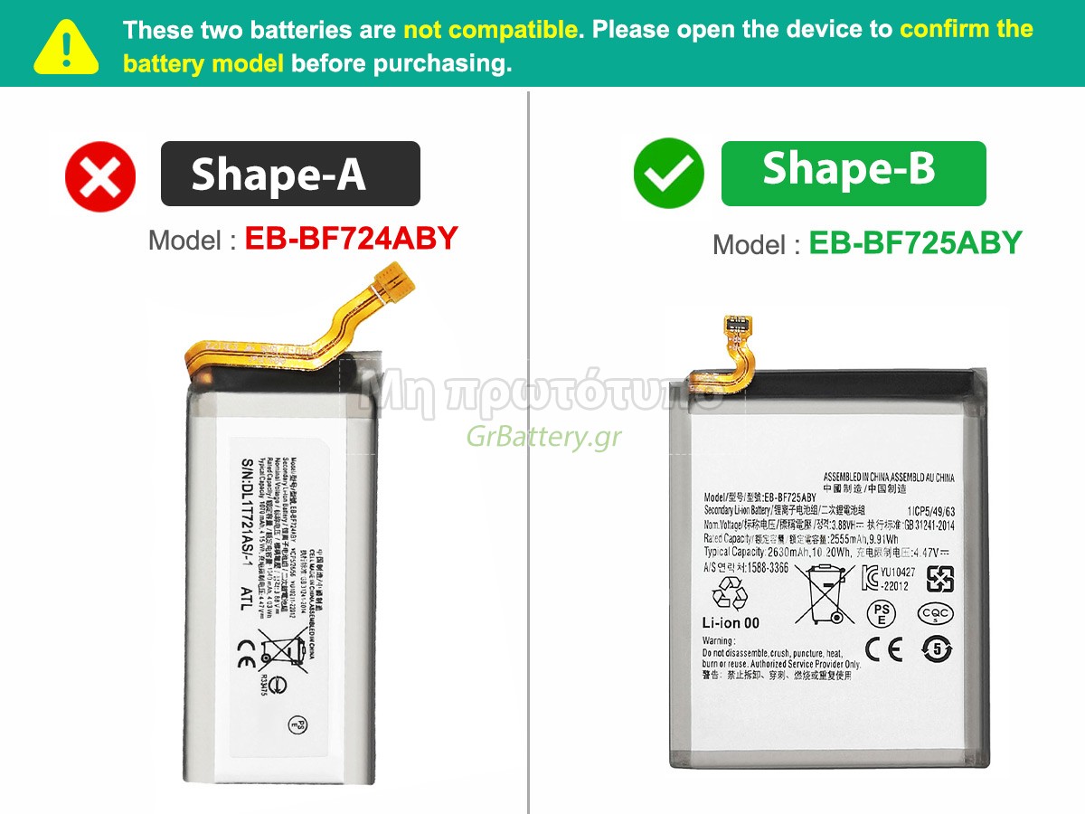 Η αντικατεστημένη μπαταρία του Samsung GALAXY Z FLIP4 SM-F721U1 είναι εντελώς νέα. Ποτέ δεν θα πουλήσουμε χρησιμοποιημένες μπαταρίες ή ανακαινισμένες μπαταρίες. Οι μπαταρίες μας είναι κατασκευασμένες από τα καλύτερα στοιχεία και εξαρτήματα
