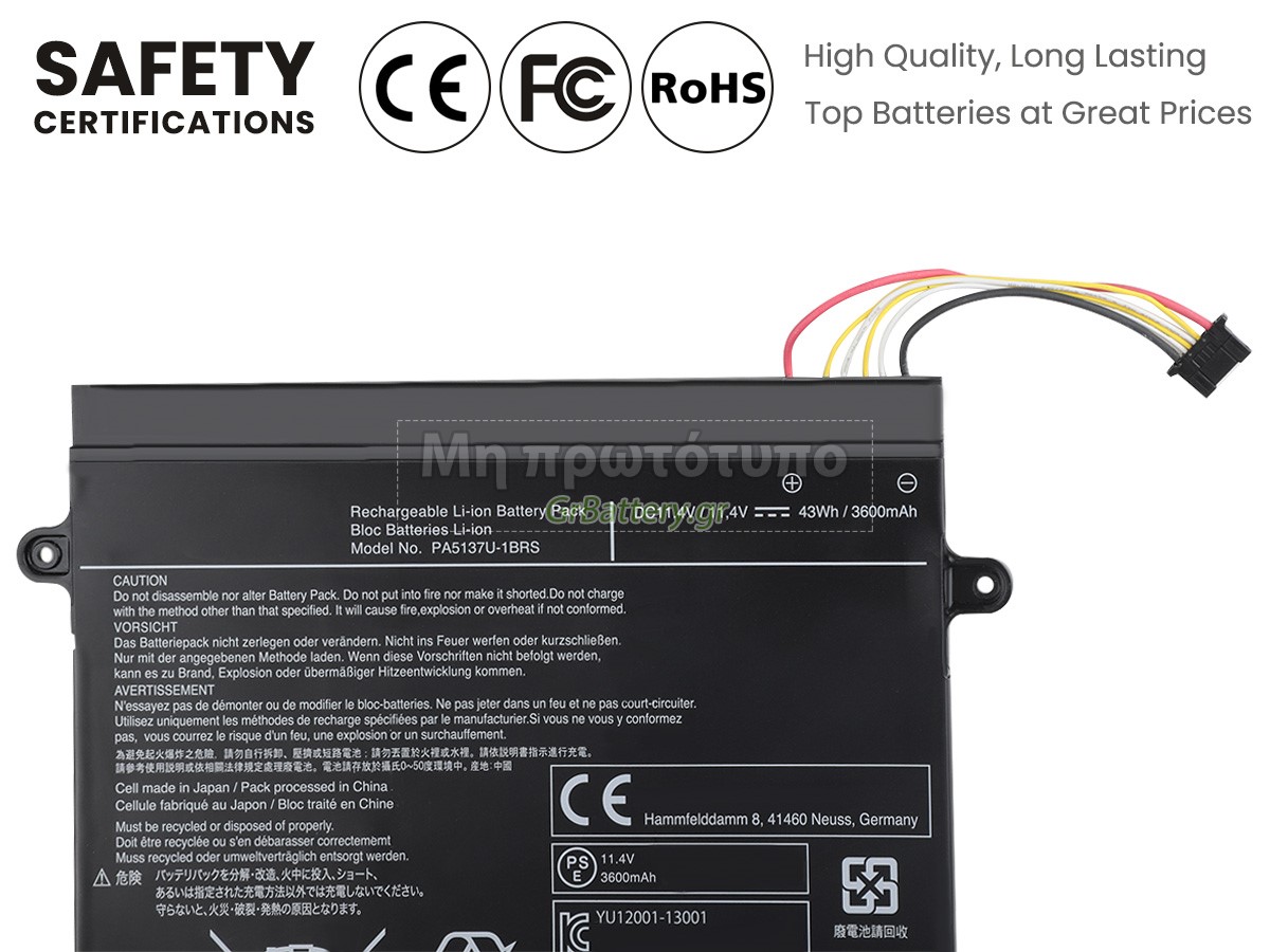 Η αντικατεστημένη μπαταρία του Toshiba PA5137U-1BRS είναι εντελώς νέα. Ποτέ δεν θα πουλήσουμε χρησιμοποιημένες μπαταρίες ή ανακαινισμένες μπαταρίες. Οι μπαταρίες μας είναι κατασκευασμένες από τα καλύτερα στοιχεία και εξαρτήματα